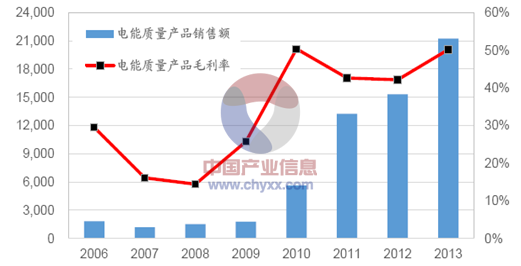 2006-2013年森源電氣電能質(zhì)量產(chǎn)品營收及毛利率(萬元)