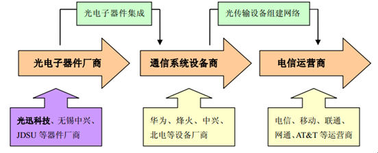 在光纖通信的產(chǎn)業(yè)鏈上,光電子器件生產(chǎn)處于產(chǎn)業(yè)鏈的上游,光電子器件行業(yè)的下游主要是通信系統(tǒng)設(shè)備行業(yè),光電子器件產(chǎn)品由通信系統(tǒng)設(shè)備廠商系統(tǒng)集成為光傳輸設(shè)備,然后再由通信系統(tǒng)設(shè)備廠商提供給電信運(yùn)營商,由電信運(yùn)營商構(gòu)建完整的通信網(wǎng)絡(luò)后向消費(fèi)者提供各種電信服務(wù)。