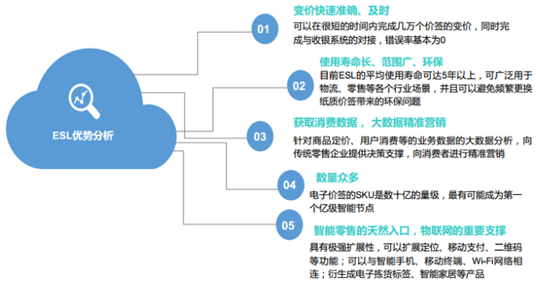 電子標(biāo)簽 優(yōu)勢漸顯 。智能電子價格標(biāo)簽是一種可替代傳統(tǒng)紙質(zhì)價格標(biāo)簽的電子顯示裝置。每一個電子價格標(biāo)簽通過有線或者無線網(wǎng)絡(luò)與商場計算機數(shù)據(jù)庫相連,并將最新的商品價格通過電子價格標(biāo)簽上的屏顯示出來。電子標(biāo)簽具備變價快速準(zhǔn)確、及時;使用壽命長、范圍廣、環(huán)保;獲取消費數(shù)據(jù),大數(shù)據(jù)精準(zhǔn)營銷;智能零售的天然入口等五大優(yōu)勢,有望成為線下零售商轉(zhuǎn)型 O2O 的重要抓手。