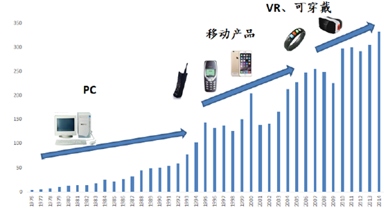 半導(dǎo)體是需求推進的市場,在過去四十年中,推動半導(dǎo)體業(yè)增長的驅(qū)動力已由傳統(tǒng)的PC及相關(guān)聯(lián)產(chǎn)業(yè)轉(zhuǎn)向移動產(chǎn)品市場,包括智能手機及平板電腦等,未來則可能向可穿戴設(shè)備、VR/AR設(shè)備轉(zhuǎn)移。