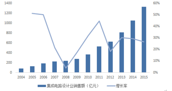 中國積極布局fabless。從銷售額來看,中國芯片設(shè)計業(yè)持續(xù)高速增長,產(chǎn)值由2004年82億元逐年成長至2015年1325億元,2004~2015年復(fù)合成長率達29%。