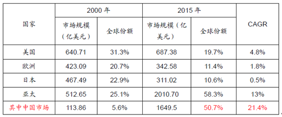 2000年~2015年的16年里,中國半導(dǎo)體市場增速領(lǐng)跑全球,達到21.4%,其中全球半導(dǎo)體年均增速是3.6%,美國將近5%,歐洲和日本都較低,亞太較高13%。就市場份額而言,目前中國半導(dǎo)體市場份額從5%提升到50%,成為全球的核心市場。